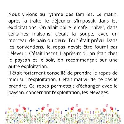 Je voulais laisser une trace de ma vie de contrôleur laitier. Marie est venue plusieurs fois à la maison pour m’écouter raconter mon parcours dans les fermes et les rencontres qui ont marqué mon métier. Les échanges ont été simples et naturels. Elle prend le temps d’écouter et respecte ce que l’on veut dire. Le livre correspond bien à ce que j’avais en tête. J’espère que ce livre pourra servir à ceux qui viendront après.